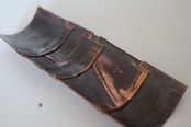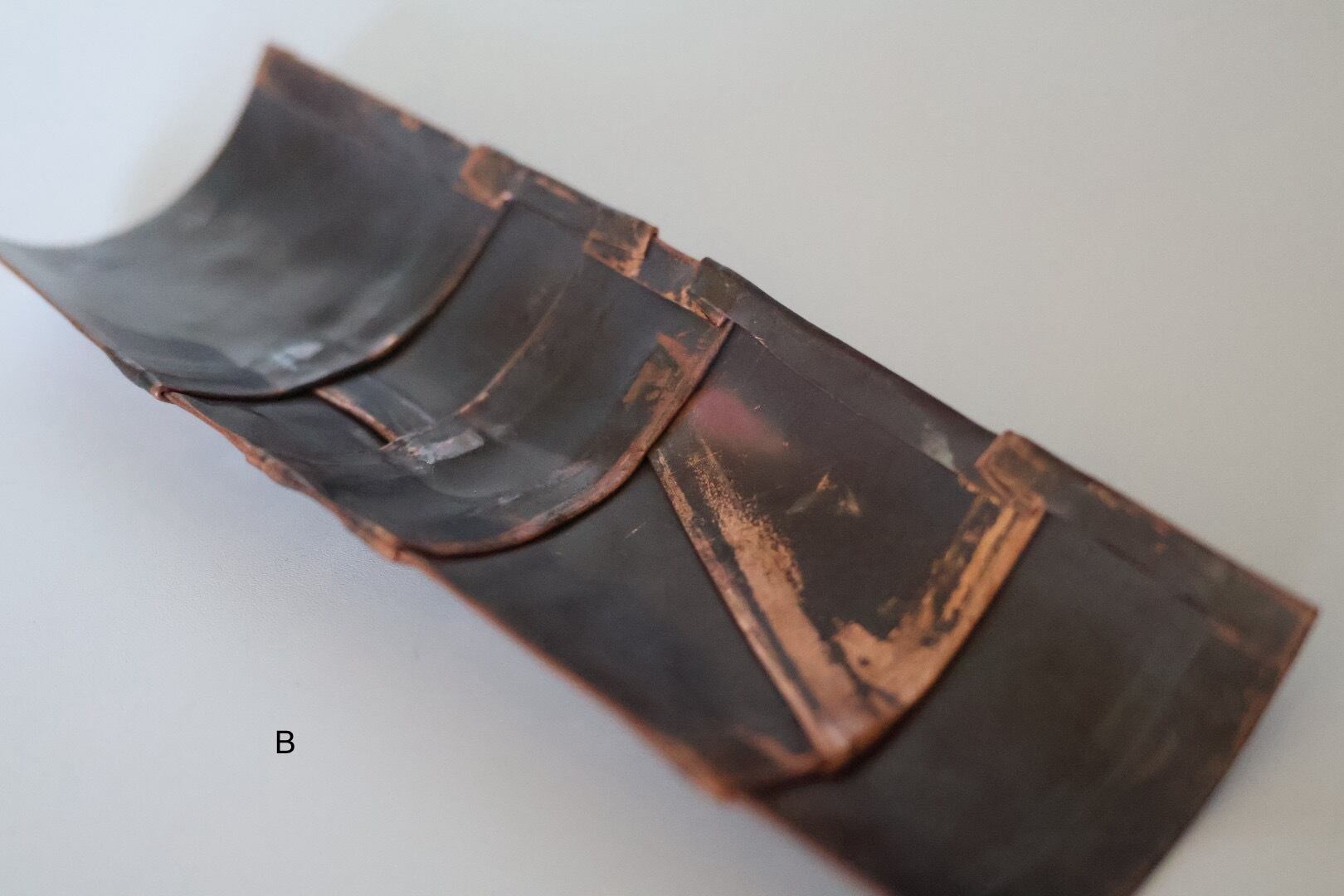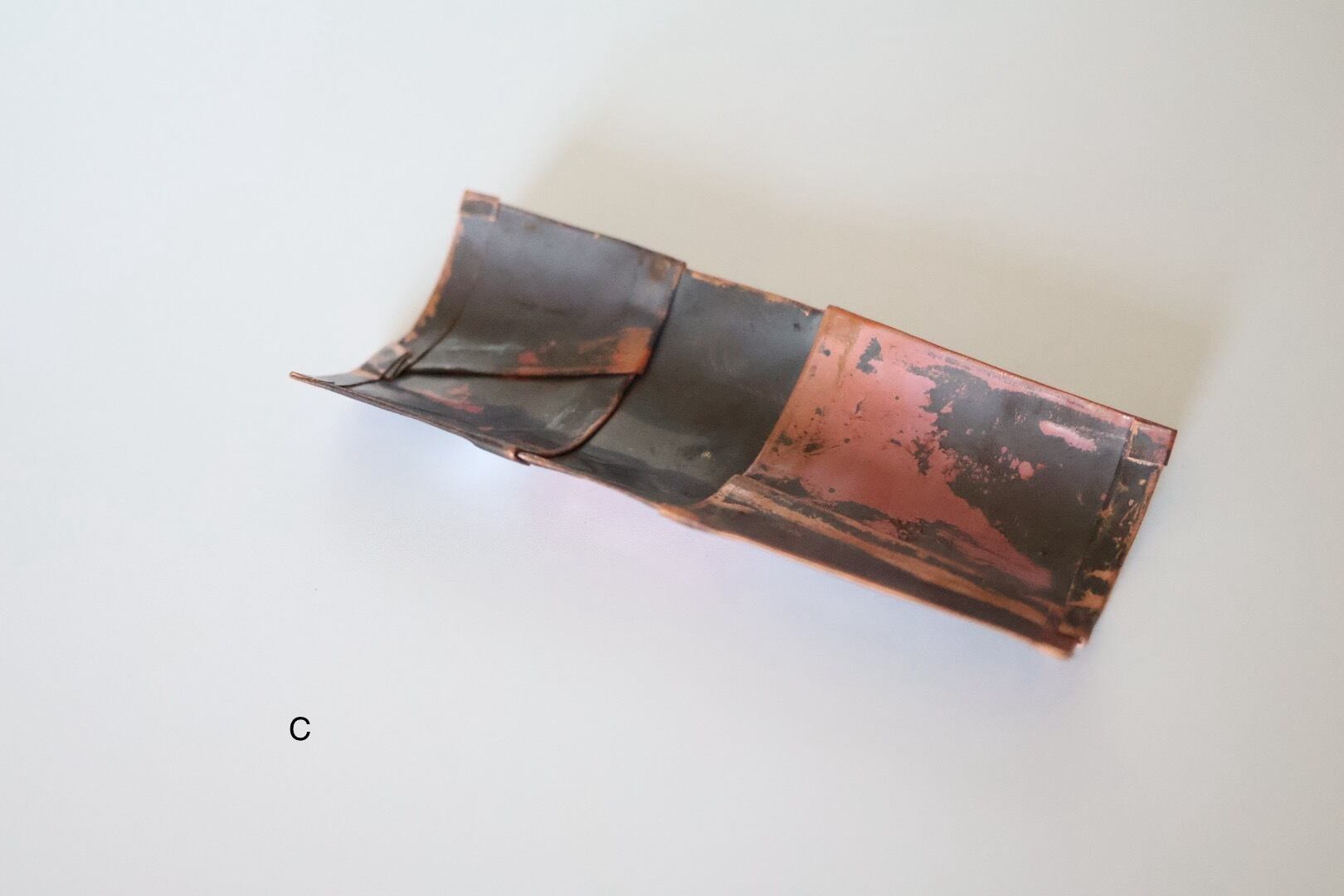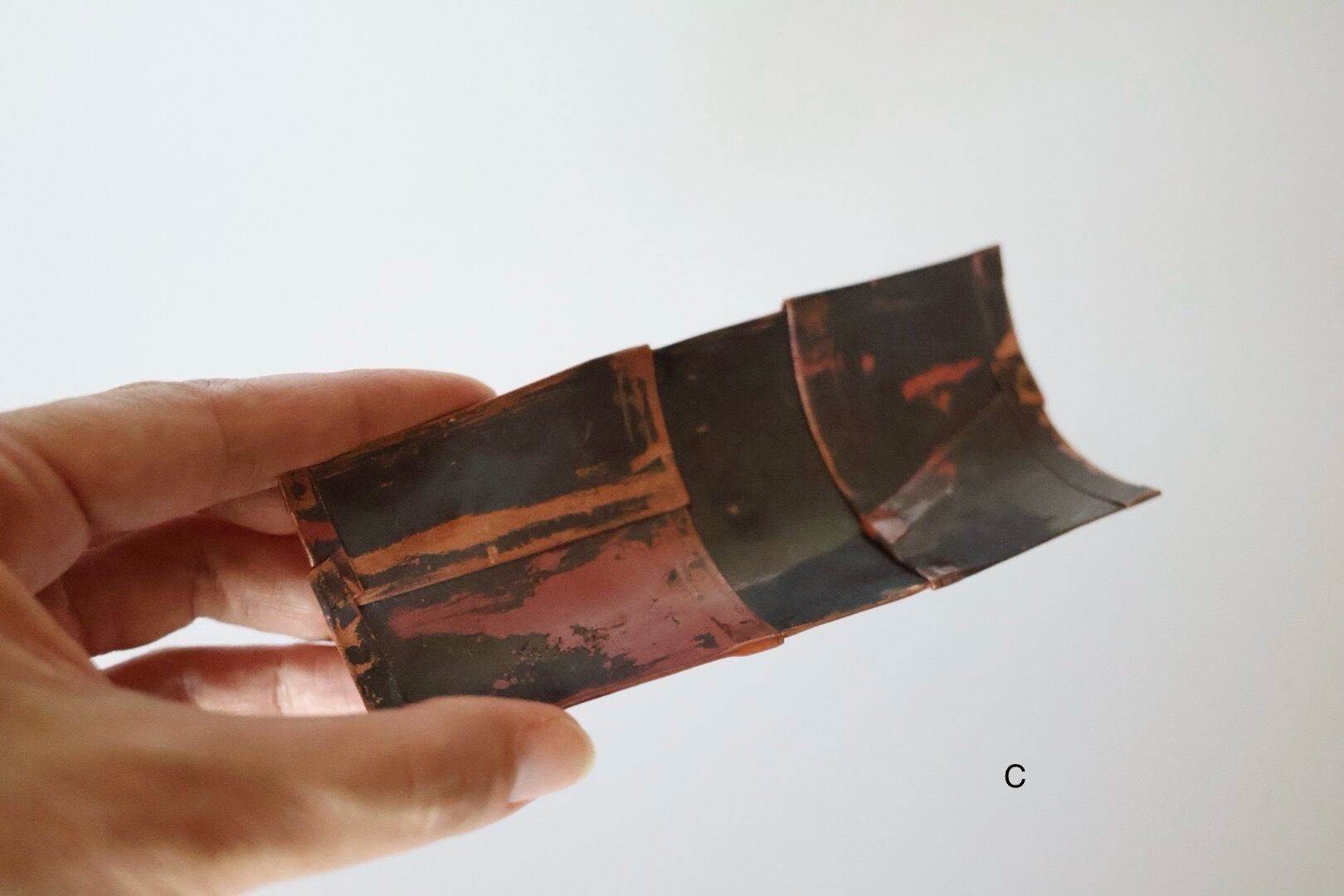 ◯茶道具のひとつの茶則。茶則があるだけで本格的な雰囲気が味わえますね。茶道具以外としてアクセサリートレイやちょっとしたデスク周りのトレイとして使ってもカッコ良さそうです。銅に熱を与えてときに出た黒の表情がかっこいい作品です。