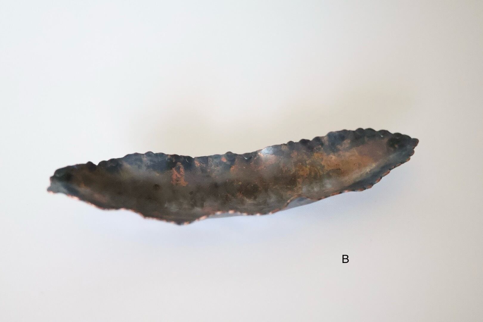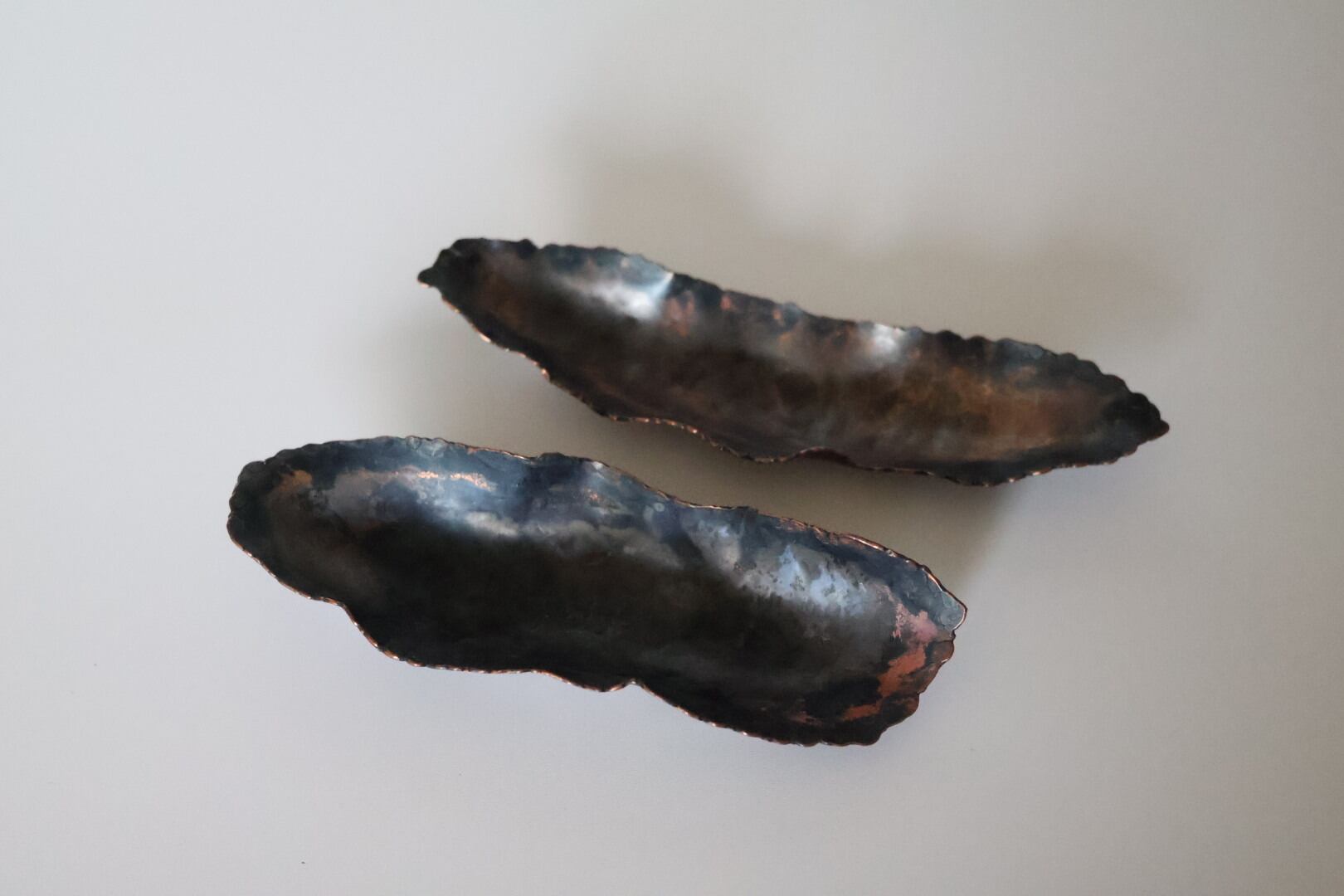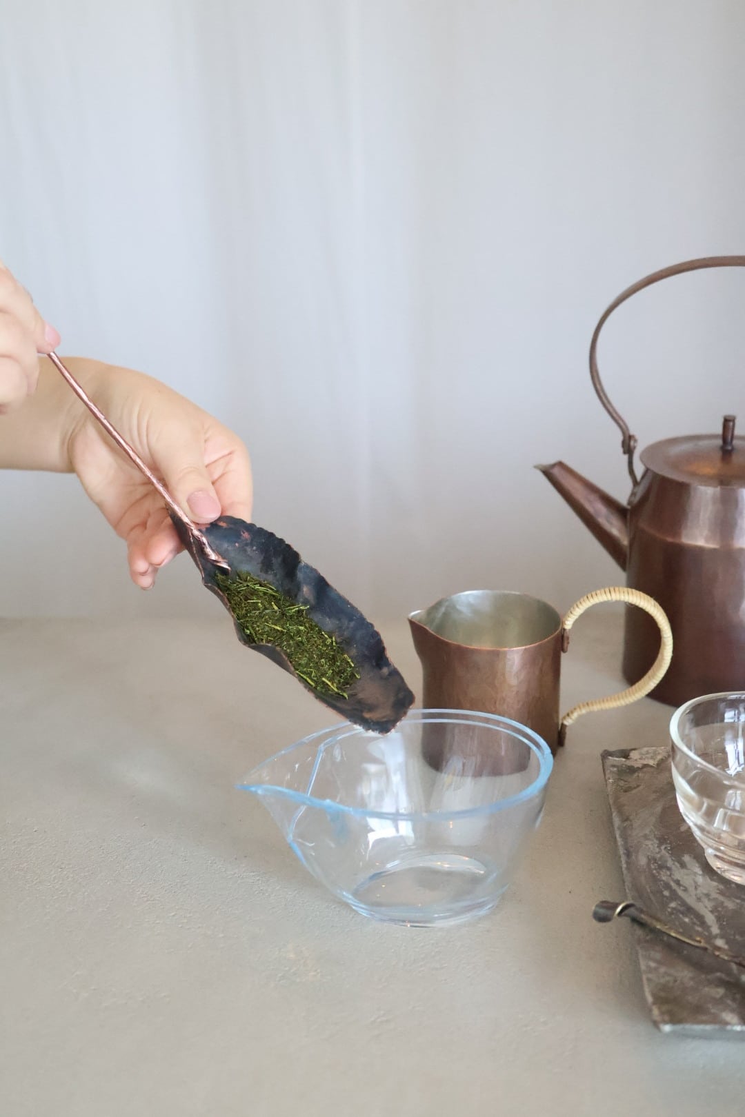 ◯茶道具のひとつの茶則。茶道具以外としてアクセサリートレイやちょっとしたデスク周りのトレイとして使ってもカッコ良さそうです。銅に熱を与えてときに出た黒の表情がかっこいい作品です。