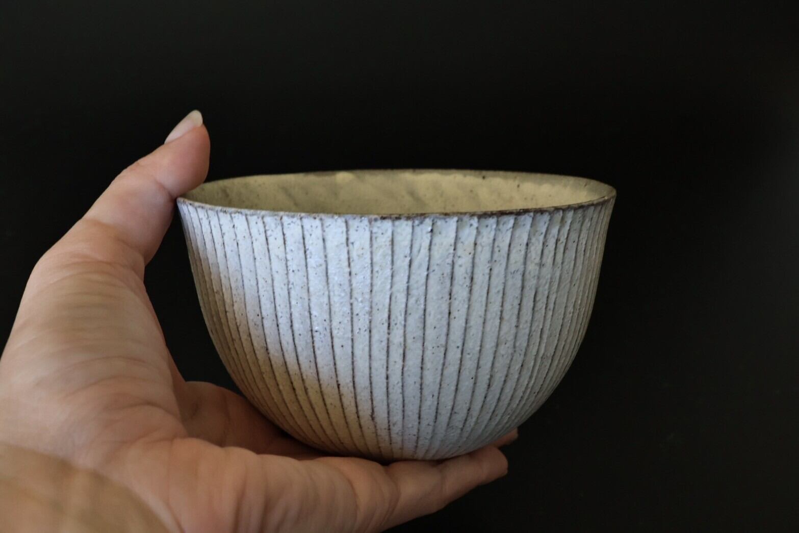 ○粉引の風合いのあたたかさと、繰り返し重ねて丁寧な手仕事によってできた線の優しくてどこかなつかしさを感じる作品です.ご飯であればたっぷり盛れ、小丼ぶりとして軽めの丼ものやおうどん等の時にも活躍してくれます.副菜を食卓に出す時にも良いサイズ感です.