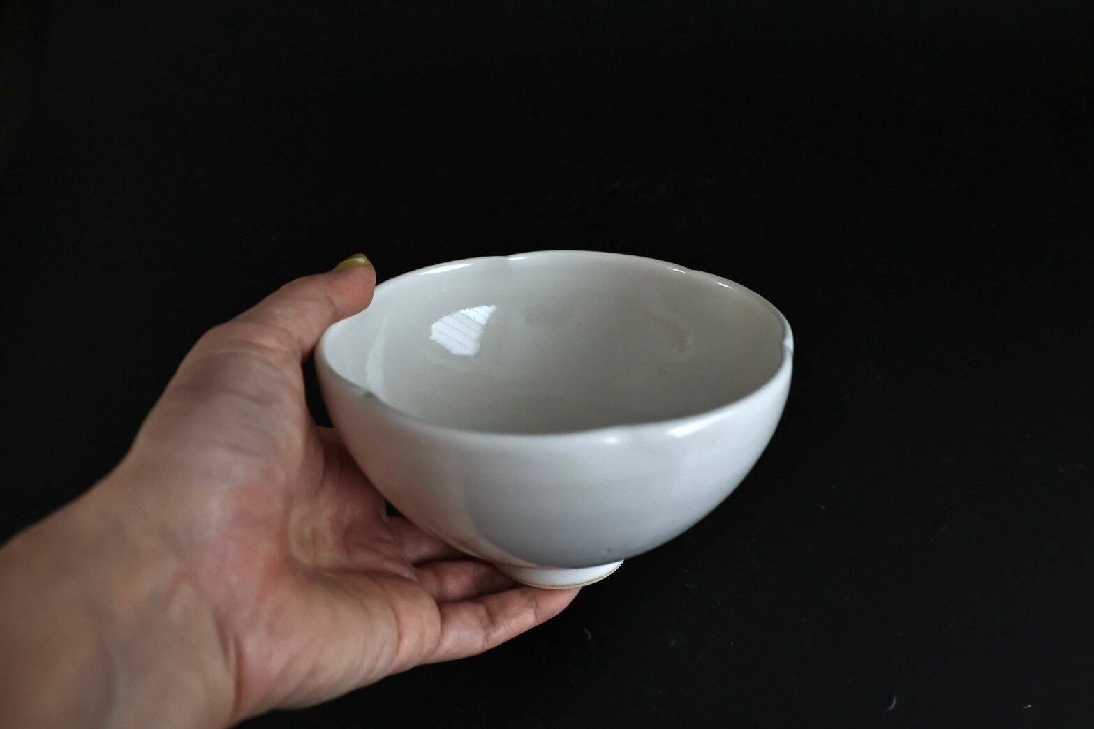 ○艶々な光沢のある白に品や清潔感を感じる優しいお花の形の縁をした器です。軽めの丼物やお蕎麦やおうどん、サラダボール・お雑煮やぜんざいなどを盛るのに良いサイズ感です.たっぷりのホカホカご飯ならこの大きさでも⚪︎